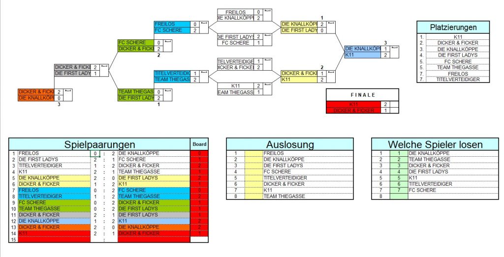Von Anfang an gab es schöne und spannende Spiele mit Klingel da und Klingel hier. Um kurz nach 22:00 Uhr stand dann der Sieger fest. Der „krumme Rücken“ mit Uschl/Stipper gewannen gegen die „TSG Besoffenheim“ (Marc/Martin) die ihren Namen alle Ehre machten. Den dritten Platz nach der TSG machte die „stille Woche“ mit Riecke und Thorsten. Uschl/Stipper schickten im 2.Spiel die „stille Woche“ in die Verliererrunde, dann folgte im nächsten Spiel die „TSG Besoffenheim“, wo man deutlich mit 0:2 unterlag. Nun auch in der Verliererrunde