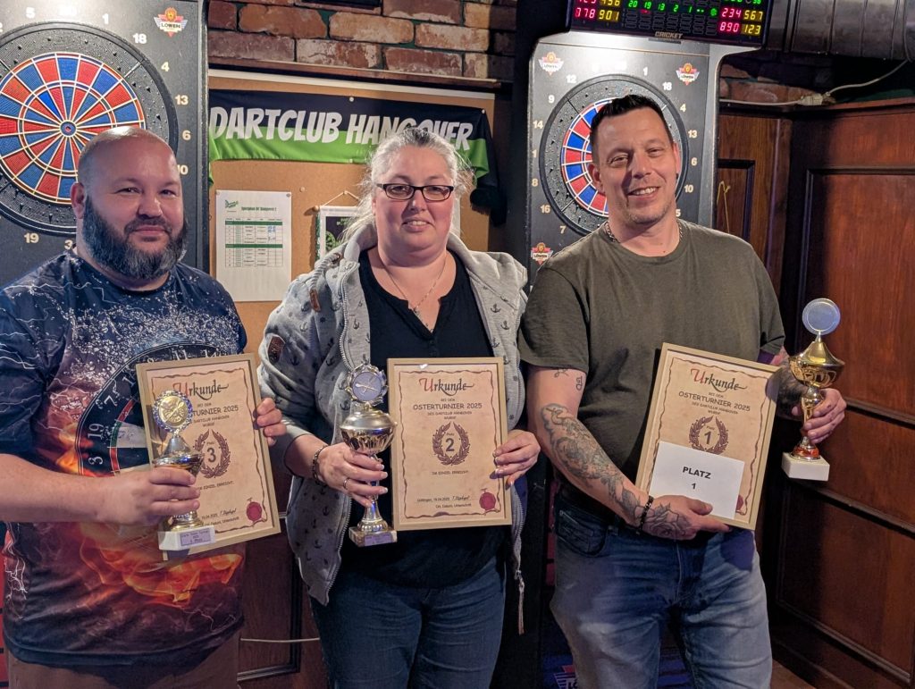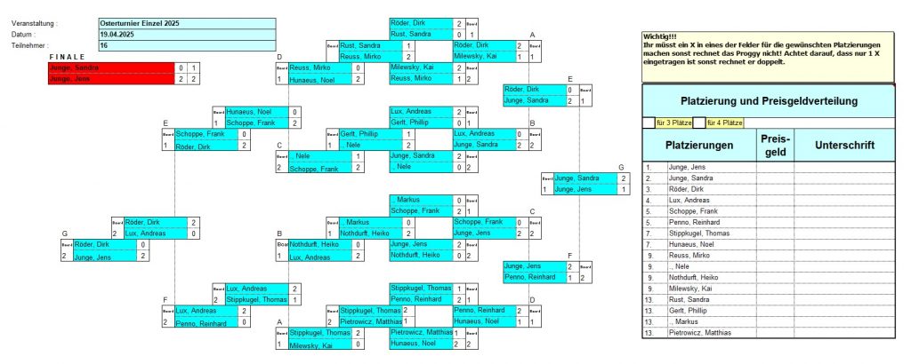 Am Samstag & Sonntag starteten wir unsere beiden Osterturniere. Am Samstag ging es mit 16 Teilnehmern im Einzel pünktlich um 16 Uhr los. In spannenden Spielen stellten sich schon bald die beiden Favoriten auf dem Turniersieg heraus. Jens konnte nach vorheriger Niederlage in der Gewinnerrunde aus der Verliererrunde kommend gegen Sandra in einem hochklassigen Match zweimal gewinnen und konnte sich so den Turniersieg sichern. Den dritten Platz konnte sich Dirk erspielen.