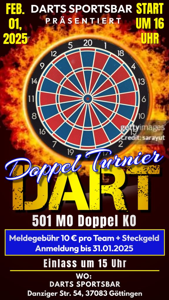 Am 01.02.2025 findet um 16 Uhr unser 1. Turnier statt. Wir spielen ein Doppel-Turnier im Modus 501 MO Doppel k. o. Das Startgeld beträgt 10 € pro Team. Außer Gute Laune, Durst, Dartpfeile und das erforderliche Steckgeld ist nichts mitzubringen. Über rege Beteiligung würden wir uns riesig freuen.